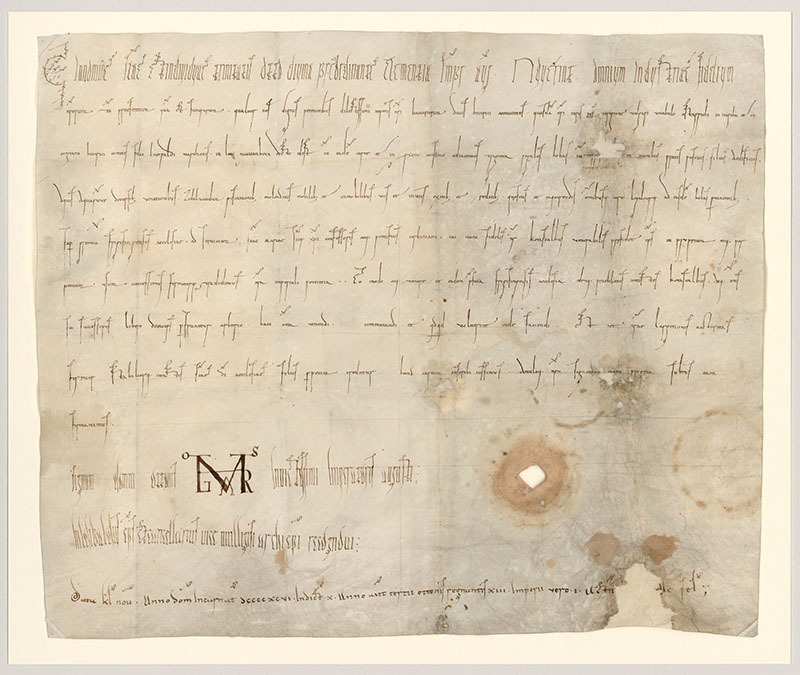 Auf seiner Rückreise von Rom macht der frisch gekrönte Kaiser Otto III. (983-1002) in Bruchsal am Oberrhein halt. Mit der dort auf Bitten Herzog Heinrichs IV. von Bayern ausgestellten Urkunde überträgt er dem Freisinger Bischof Gottschalk das Eigentum an einem Fronhof und dreißig Königshufen in der Gegend von Neuhofen an der Ybbs. Diese Region gehörte zu diesem Zeitpunkt noch zum Herzogtum Bayern. Erwähnt wird in der Urkunde aber auch die Lage dieser Güter im Herrschaftsbereich des Babenberger Markgrafen, Heinrichs I. Ein Rechtsgeschäft wie dieses ist für das Mittelalter alles andere als ungewöhnlich. Bemerkenswert ist allenfalls der Umfang der Schenkung, der für das Hochstift Freising einen bedeutenden Besitzzuwachs bedeutete. Heute ist man überzeugt, dass die Urkunde nicht in einem Schritt erstellt und ausgefertigt wurde. Vielmehr wird angenommen, dass die Kanzlei des Kaisers zunächst nur den Schlussteil der Urkunde (Eschatokoll) verfasst hat, das heißt die Signumoder Unterschriftszeile mit dem Monogramm, die Rekognitionszeile, in der der Name des für die Ausfertigung verantwortlichen Kanzlers, des Bischofs Hildibald, genannt wird, und die Datierung. Dagegen stammen das Eingangsprotokoll, vor allem aber der Kontext, das heißt der Rechtsinhalt im engeren Sinne, von der Hand eines Freisinger Schreibers. Ein solches Vorgehen war – gerade im Falle der Freisinger Kirche – nicht ungewöhnlich und gilt daher sogar als ein Indiz für die Echtheit der Urkunde.
