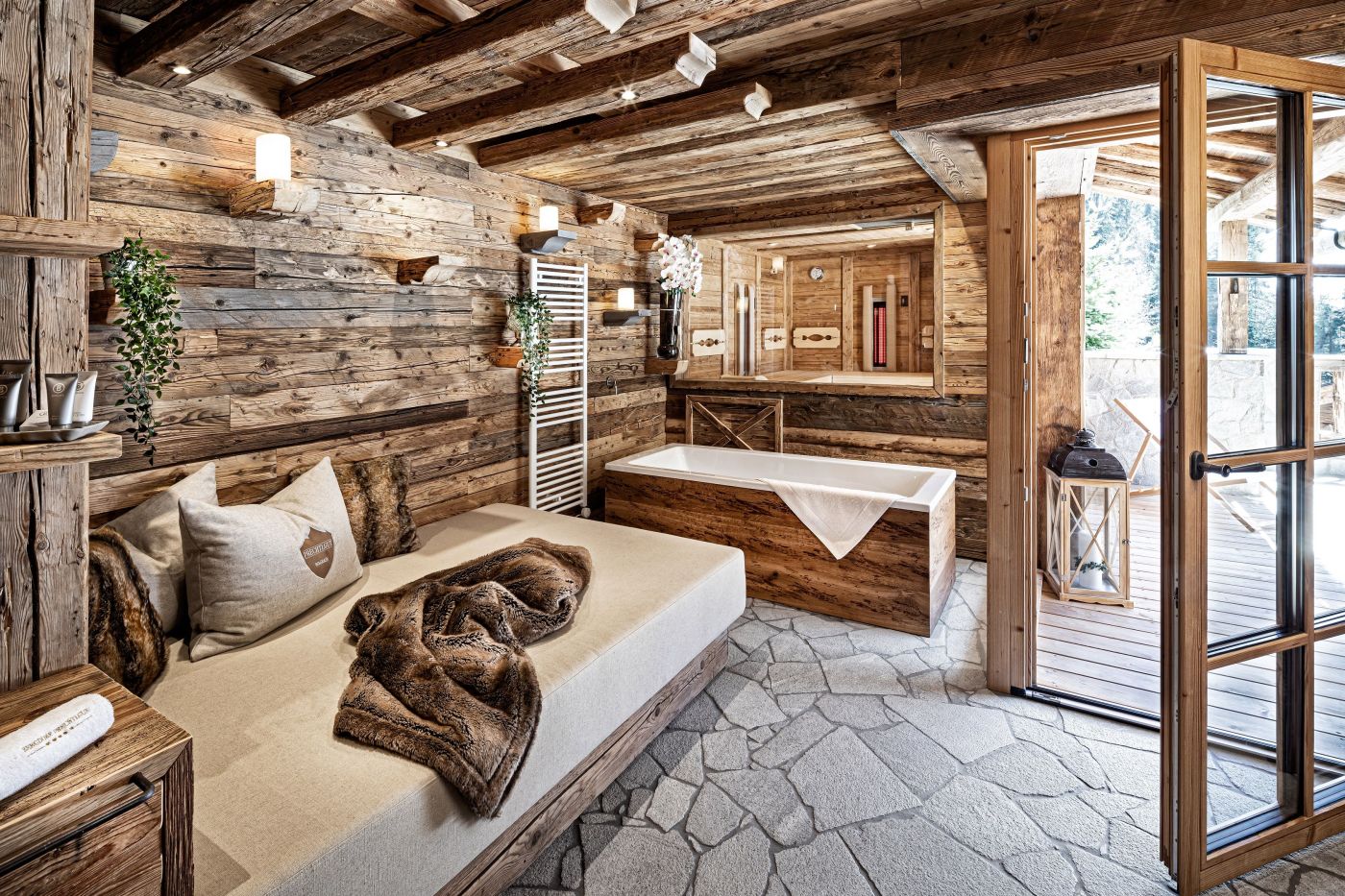 Dazu zählen eine eigene Sauna-Dampfkabine samt Ruheraum, eine freistehende Badewanne und ein Hot Tub auf der Hausterrasse. Vor allem aber bieten die Luxus-Chalets wesentlich mehr Distanz, Platz, Ruhe und persönliche Freiheit als jedes Hotel. Der Almfrühstückskorb wird direkt ins Chalet geliefert und der Frühstückstisch gedeckt.
