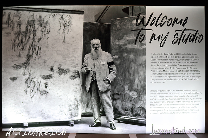 Die erste Reisestation repräsentiert das Atelier des Begründers des Impressionismus, den Schaffensplatz seiner großen Werke. Es wird eine neue Perspektive auf die Werke des Künstlers geboten, die das Publikum nicht nur in seine Gemälde, sondern auch in seine Wahrnehmungen, Techniken und Wege der Konzeption seiner Kunst eintauchen lässt. Die zentralen Themen Monets – wie Licht, Schatten, Wind und das Element des Wassers als Reflexionsfläche – werden integriert und durch modernste Technik in ein poetisches Gesamtkonzept verwoben.
