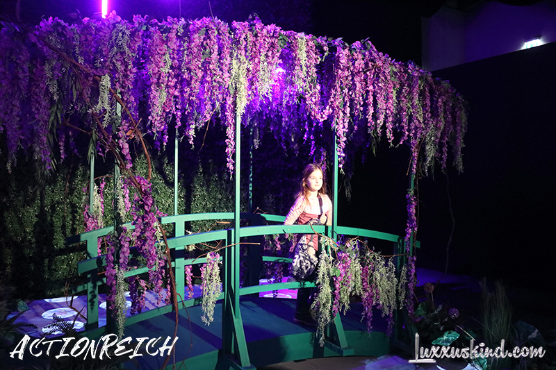 Vom Atelier geht es weiter zur Inszenierung von Monets Garten, der weltberühmten Gartenlandschaft in Giverny in der Normandie. Über die Brücke gelangt man in das Haus von Monet, in der eine große Wandprojektion interaktiv von den Besucher:innen selbst bespielt werden kann – ein zugleich physisches wie poetisches Erlebnis.