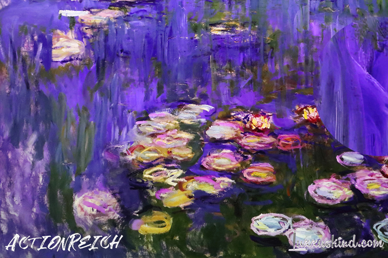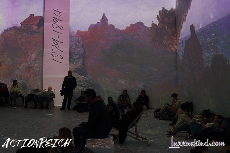 Im dritten Akt – dem Highlight der Ausstellung – tauchen die Reisenden dann ganz in die Bilder Monets ein, um diese wahrhaftig zu erleben und sich in der Poesie der weltberühmten Werke wie Das Kap von la Héve bei Ebbe, Die Dame im grünen Kleid oder Das Atelierboot zu verlieren. Die Seerosenbilder, Höhepunkt von Monets Schaffen, werden als Finale der Geschichte präsentiert und das ganz im Sinne des großen Meisters: der gesamte Raum wird zu einem gigantischen Seerosenteich, wodurch die Illusion eines endlosen Ganzen entsteht. Die Betrachter:innen befinden sich inmitten der Gemälde, versinken in Licht und Ton, und werden so Teil der Szenerie – die Kunstwerke interagieren mit ihnen und Kunst wird zur vollendeten Poesie.