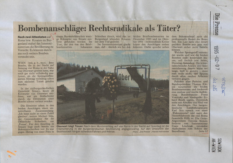 Der Terror adressierte ausschließlich Minderheitenangehörige und ihre politisch-humanistischen Unterstützer:innen. Der folgenschwerste Anschlag fand im Februar 1995 im burgenländischen Oberwart statt, bei dem vier Roma-Angehörige einer Sprengfalle zum Opfer fielen. Josef Simon, Karl Horvath, Erwin Horvath und Peter Sarközi starben durch eine Explosion, als sie eine Tafel mit der Inschrift „Roma zurück nach Indien!“ entfernen wollten.