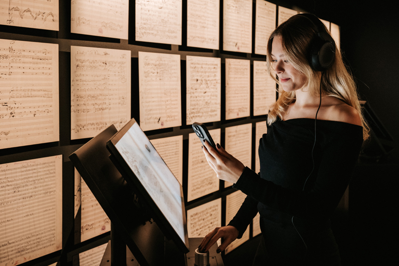 Ein Höhepunkt der Schau ist die „Komponiermaschine“ – ein verspieltes, beinahe magisches Instrument, das die Gäste selbst in den Schaffensprozess eintreten lässt. Mit Drehknöpfen, die wie Walzertakte zu schwingen scheinen, formen sich auf einem Bildschirm Notenfolgen, bis schließlich ein eigener Walzer erklingt. Wer möchte, nimmt sein Werk als Audiodatei mit nach Hause – ein klingendes Souvenir, das den Walzerkönig in das digitale Zeitalter verlängert.