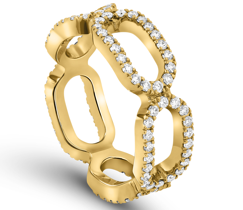 Der „Link“-Ring von Bucherer Fine Jewellery fängt dieses Gefühl auf vollkommene Weise ein. Aus 18 Karat Gelbgold gefertigt und mit 100 Diamanten im Brillantschliff besetzt, lässt er das Licht in einem subtilen Tanz aus Glanz und Bewegung erstrahlen – ein Schmuckstück, das nicht nur schmückt, sondern erzählt.